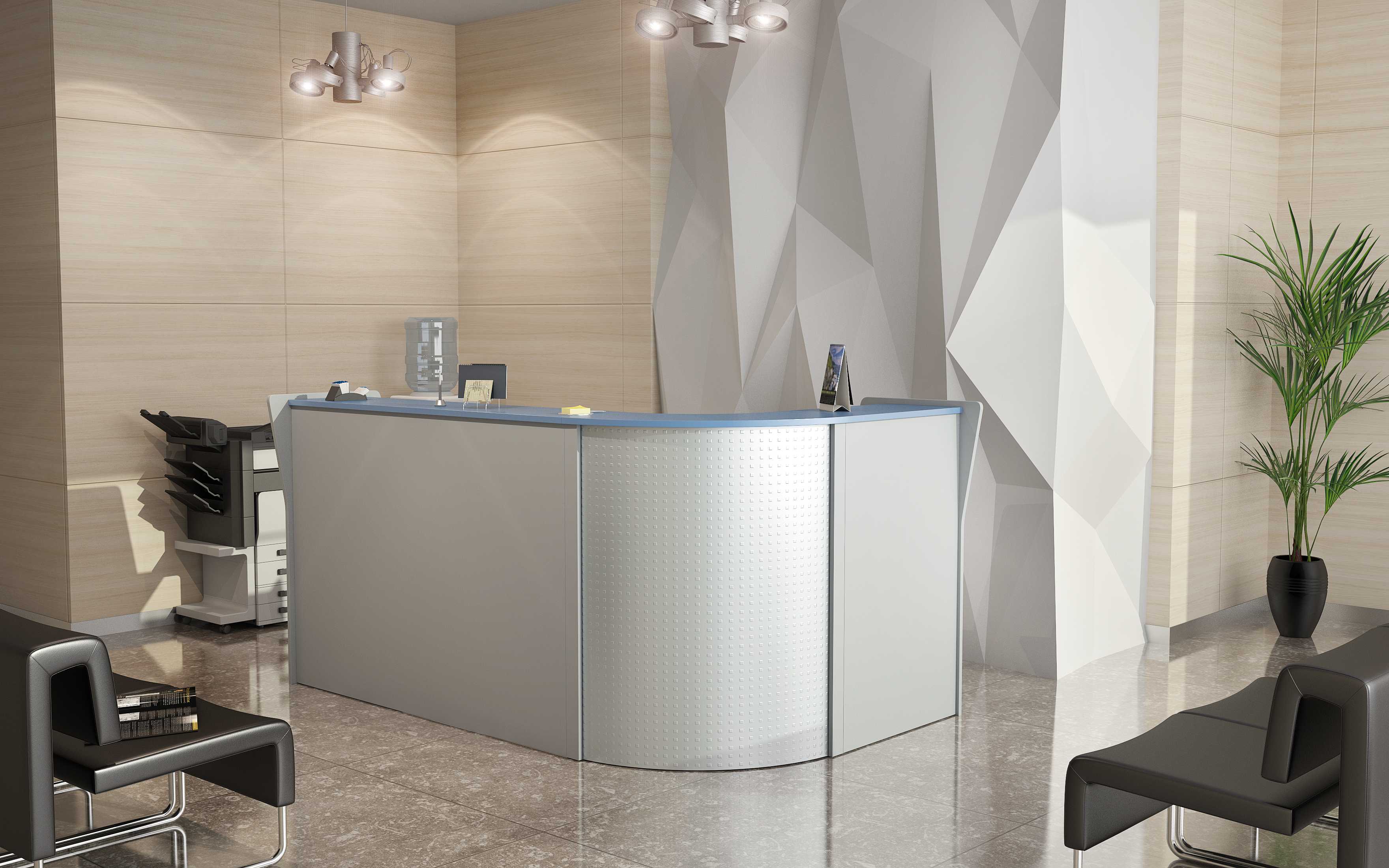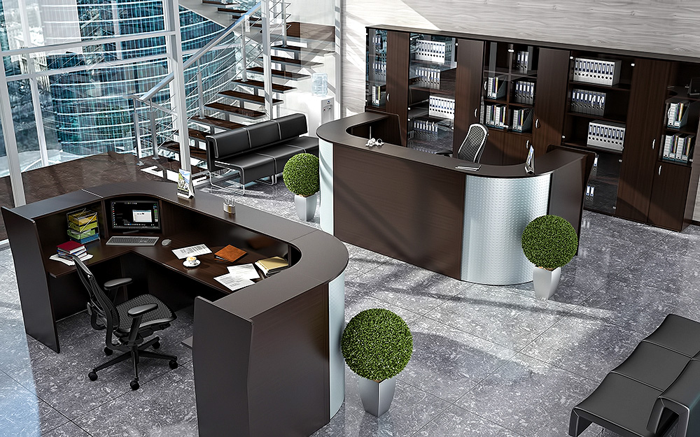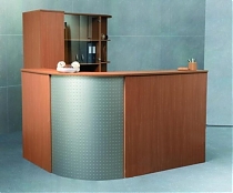 Ресепшн "Эдем Люкс" является одним из лучших образцов современной офисной мебели.Отсутствие острых углов на передней панели стойки делает её облик дружественным по отношению к посетителям. В оформлении ресепшн использованы деревянные панели с металлическими вставками.